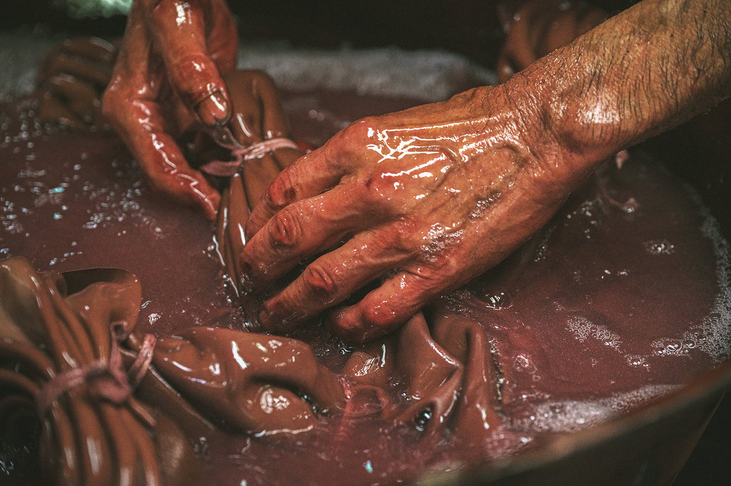 Each piece of leather is hand-tied to ensure that it is dyed in the desired pattern. With years of experience, the craftsman pinches, folds, and ties the pleats in different ways depending on the dyeing pattern. This manual work is what gives the leather its unique personality and creates miraculous patterns.