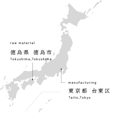 藍染は東京都台東区の工房でタデ藍から作られた徳島県産の「蒅(すくも)」を使用し発酵建てをして染めています。通常藍の発酵液はアルカリ性が強く、レザーはアルカリに弱い為、アルカリを弱めた特別な藍の発酵液を作り染色します。クロム鞣しの藍染レザーは見かけるようになりましたが、タンニン鞣しのレザーは、アルカリ耐性、水耐性が弱く染めるのが非常に難しく貴重な藍染革となっております。