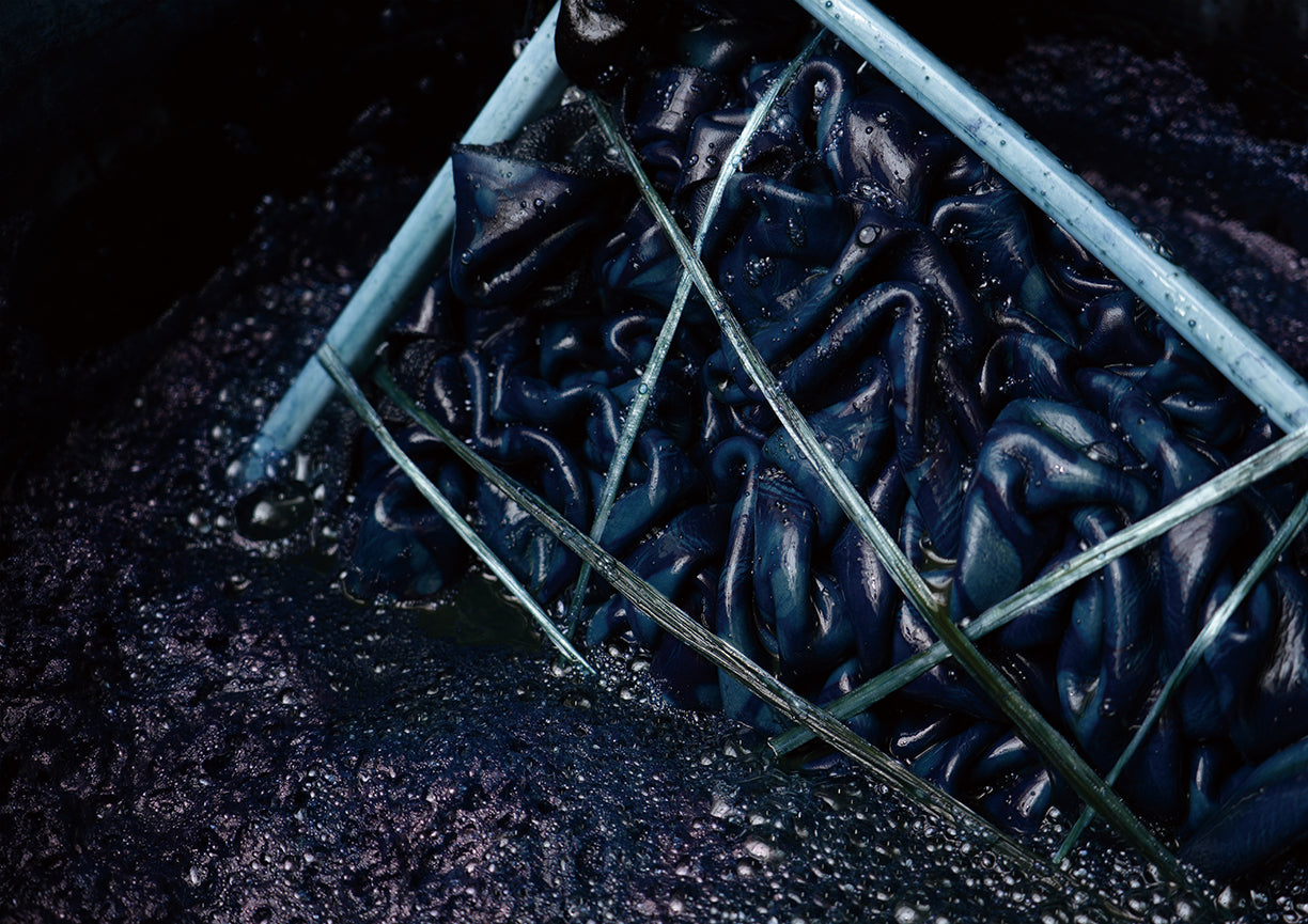 藍染は古来、中国から伝わり、江戸時代には庶民の色として親しまれました。殺菌作用が強いことから、染めた衣服で皮膚病や毒虫を防ぐなどの効果もあります。材料である藍草は小上粉、百貫、千本などの様々な品種があり、現在では徳島や宮崎、北海道などで栽培されていますが、年々生産量が減少しています。「te saho」では江戸時代より特上と評された、徳島産の小上粉の藍草を発酵させた蒅を主に使い、建染めで染重ねております。