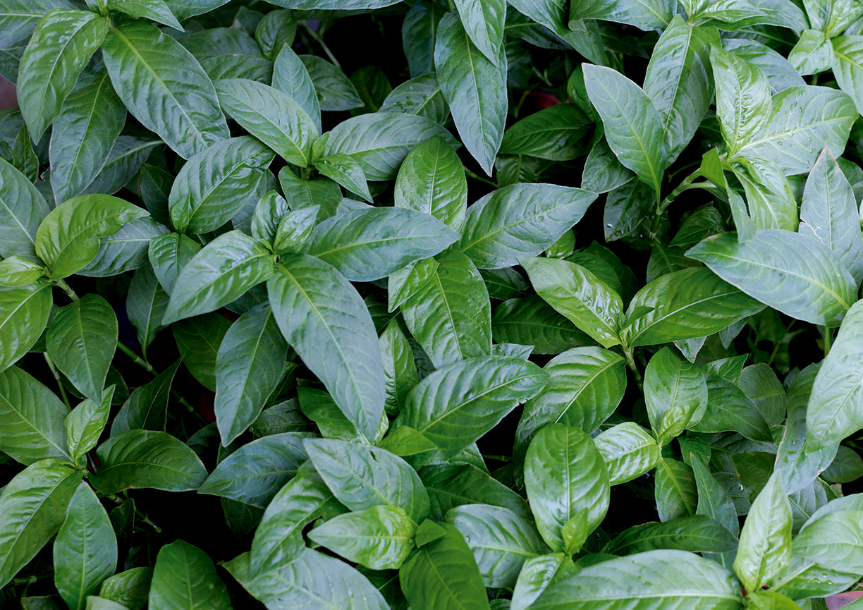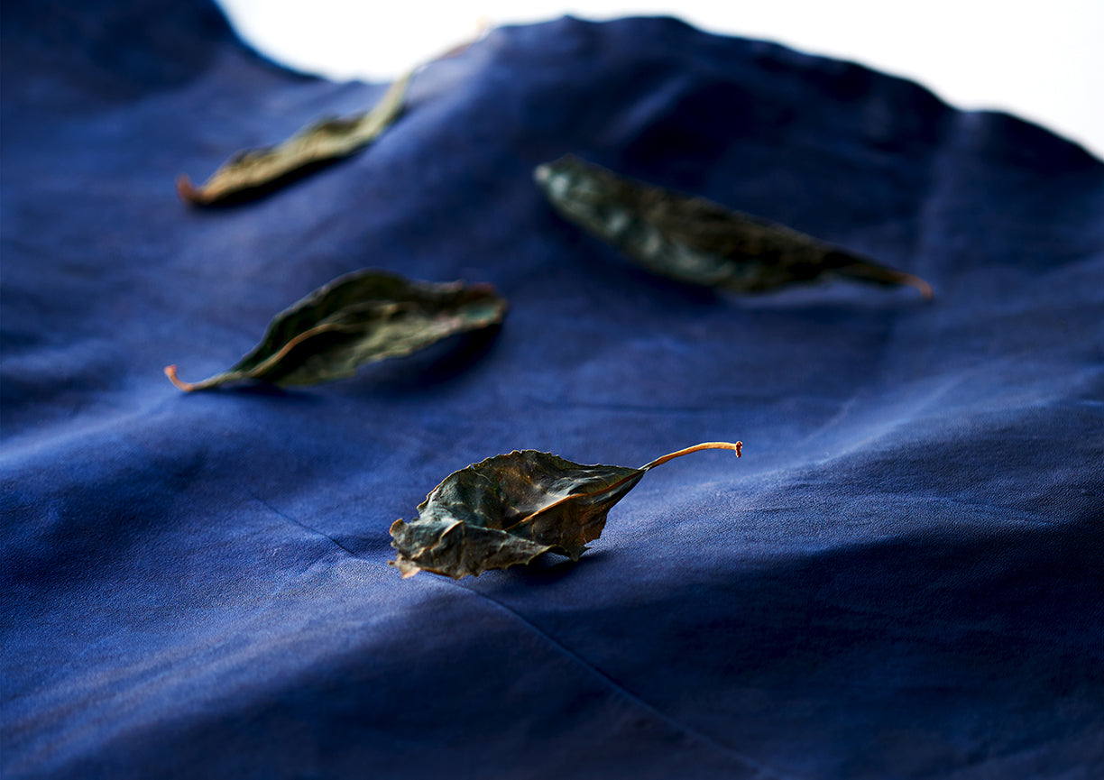 藍染は古来、中国から伝わり、江戸時代には庶民の色として親しまれました。殺菌作用が強く、染めた衣服で皮膚病や毒虫を防ぎました。小上粉、百貫、千本などの様々な品種があり、現在では徳島や宮崎、北海道などで栽培されていますが、年々生産量が減少しています。「te saho」では江戸時代より特上と評された、徳島産の小上粉の藍草を発酵させた蒅を主に使い発酵建てをして染め重ねております。