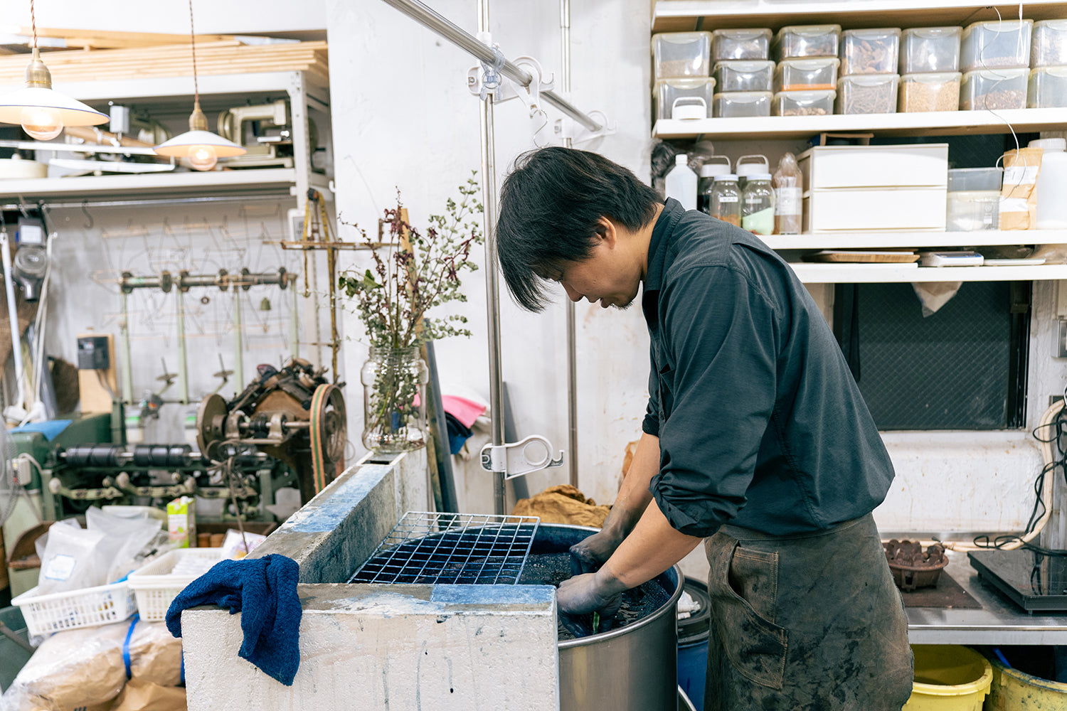 藍染は染める回数、その日の気候など環境により色の濃度が変わります。縹色(はなだいろ)で約15回、藍色で約25回ほど繰り返し染色します。