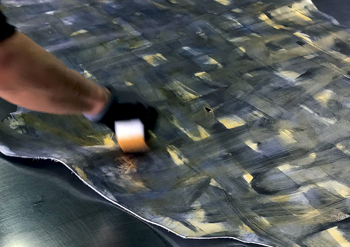 兵庫県のタンナーでクロム鞣しされた革をベースに制作された手塗りアートレザー。職人がハンドペイントにて幾重にも抽象的に多色で染め上げた後、キャンパス風のエンボスすることにより全体を締めます。鞣された革は、生きていた証として傷や擦れ、シワなどがあります。一般的には傷物として扱われる革も職人の手で一枚一枚、手塗りし仕上げることによりアートレザーが品質を上げています。一点一点職人の手染めで仕上げていく為、まったく同じ模様が無いのが特徴で自分だけのオンリーワンの模様を楽しむことが出来ます