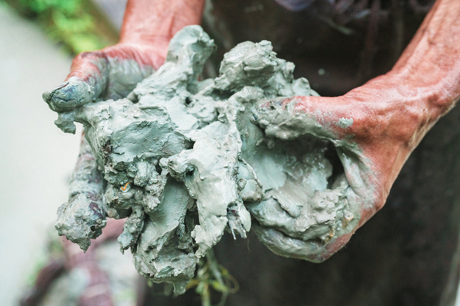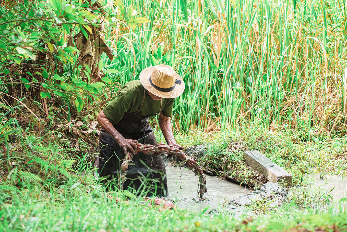 泥染めで用いる奄美大島の泥は粒子が細かく、丸く、自然界にある鉄分が豊富などの特徴があります。そして、自然界に存在する鉄分が豊富な赤土の土壌の為、たっぷり染められたタンニンと反応し 茶褐色から黒褐色へと変化していきます。この鉄媒染こそが、奄美特定の色を表現します。水田のようなところの地面を掘ってくぼみ状にし、周辺にある泥をたし入れ、鉄分の濃度を高めます。粒子が細かいのは微生物の作用によるもので、染めに使用する田は切り立った山裾にあり、山からミネラルを多く含む水が流れ込むことで、微生物の餌となり、活発に活動します。