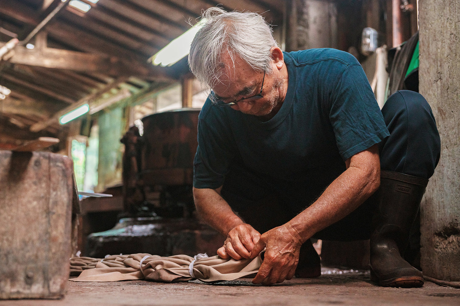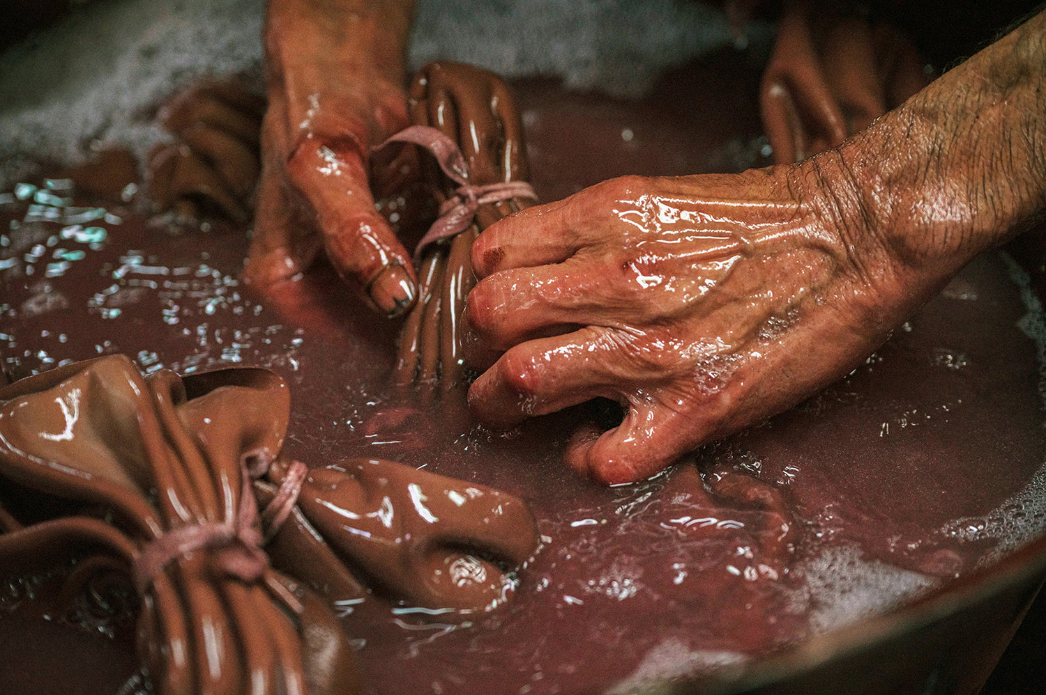 泥染めをする革を好みの柄に染まるように、一点一点手作業で縛っていきます。職人の長年の積み重ねによって、ヒダを摘まんだり、折り込んだり、縛ったりと、染めの柄によってそれぞれ絞り方法を変えます。この人の手による作業こそが、無二の個性を表現し、奇跡の模様を浮かび上がらせます。